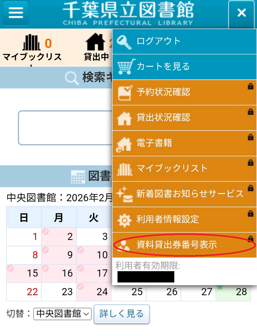 4 「利用者メニュー」をタップした後、メニュー内にある「資料貸出券番号表示」をタップします。